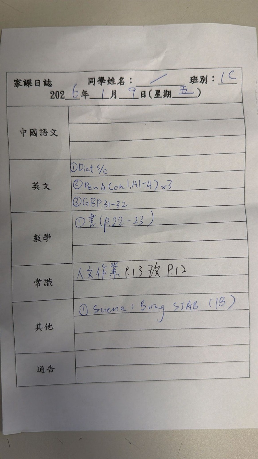 1C 家課日誌