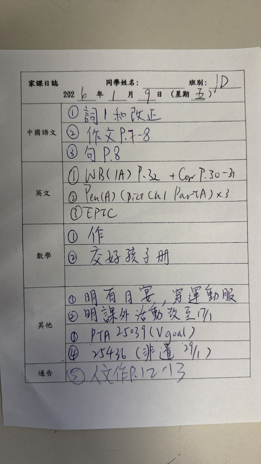 1D 家課日誌