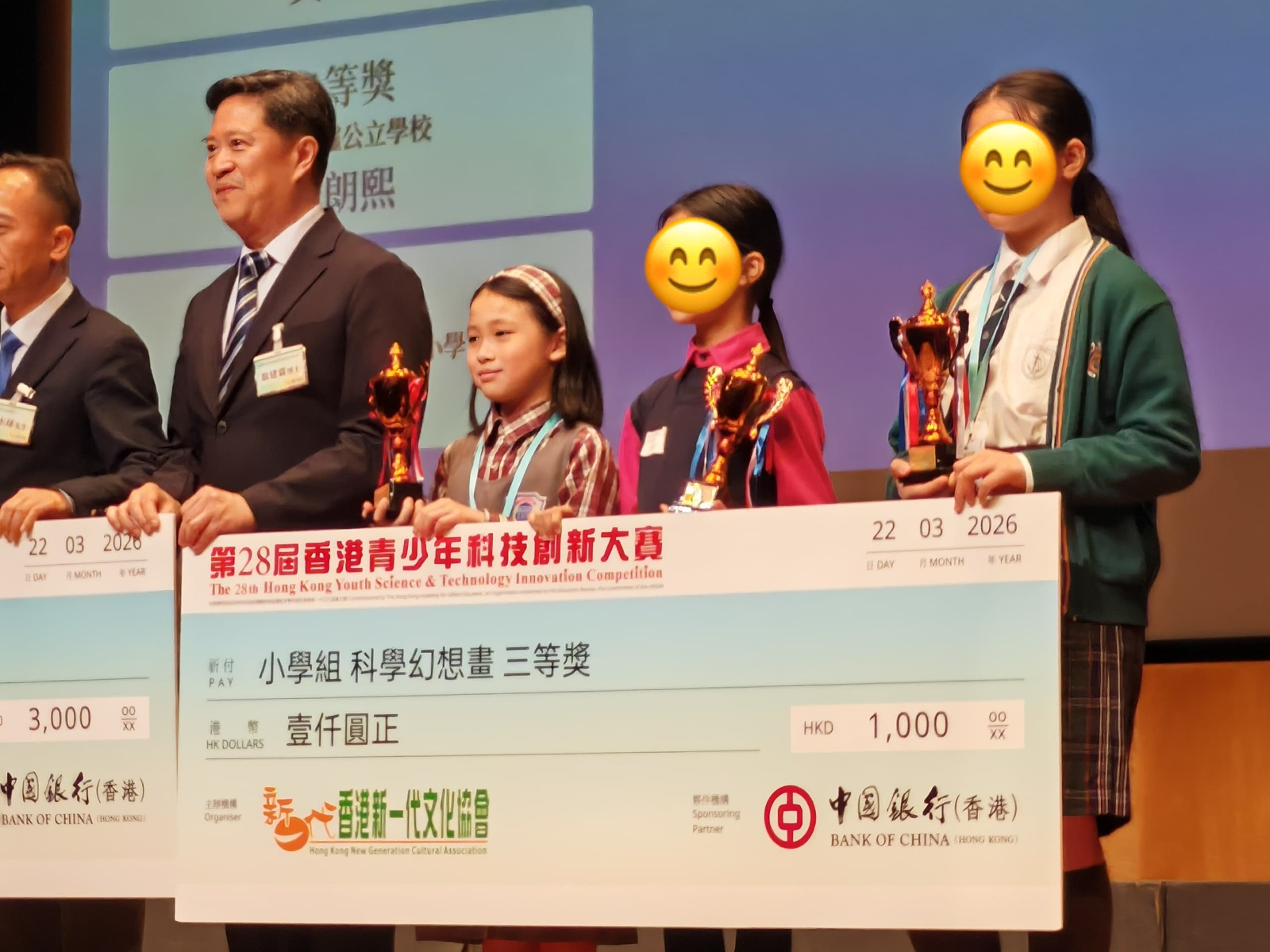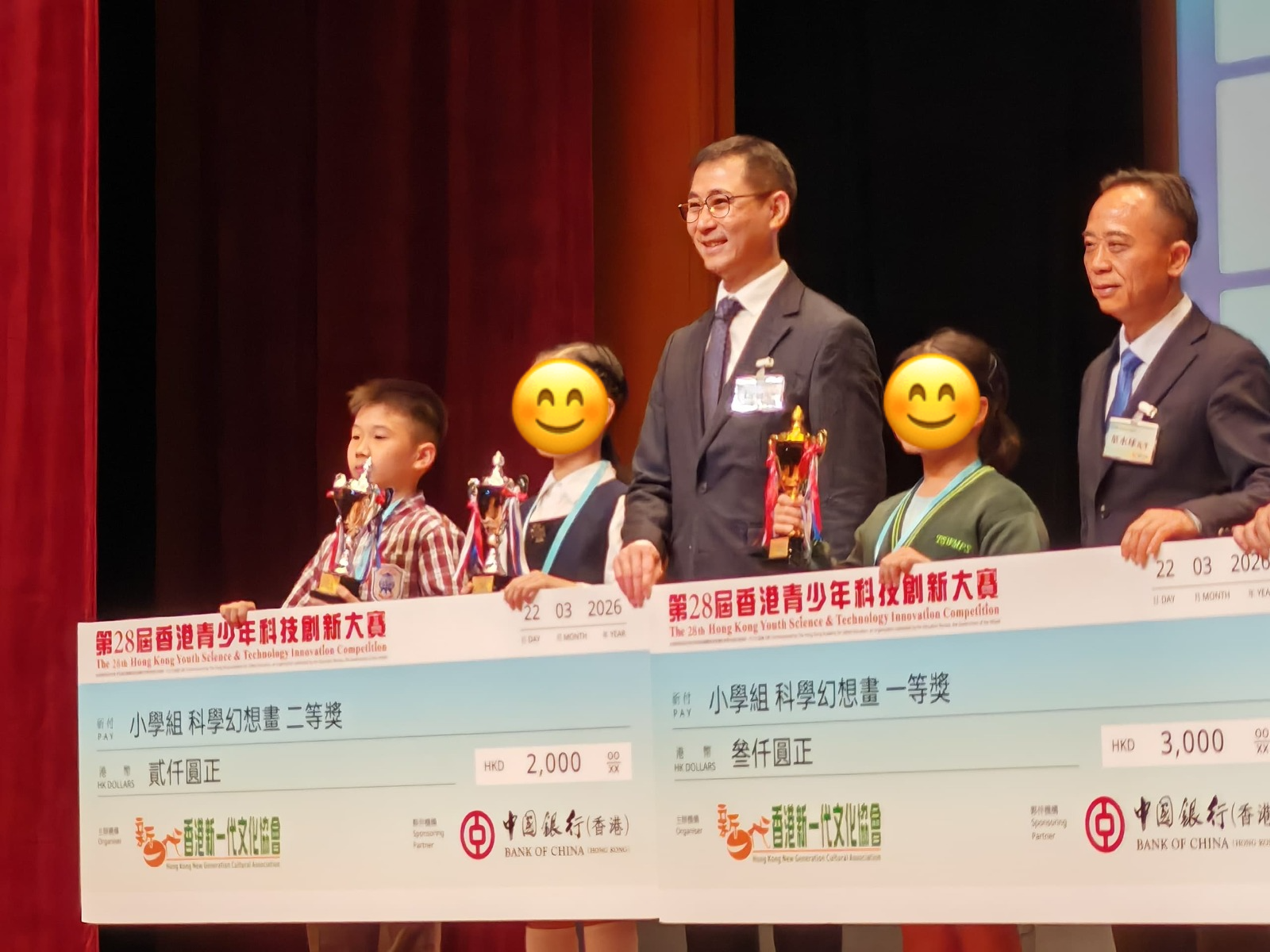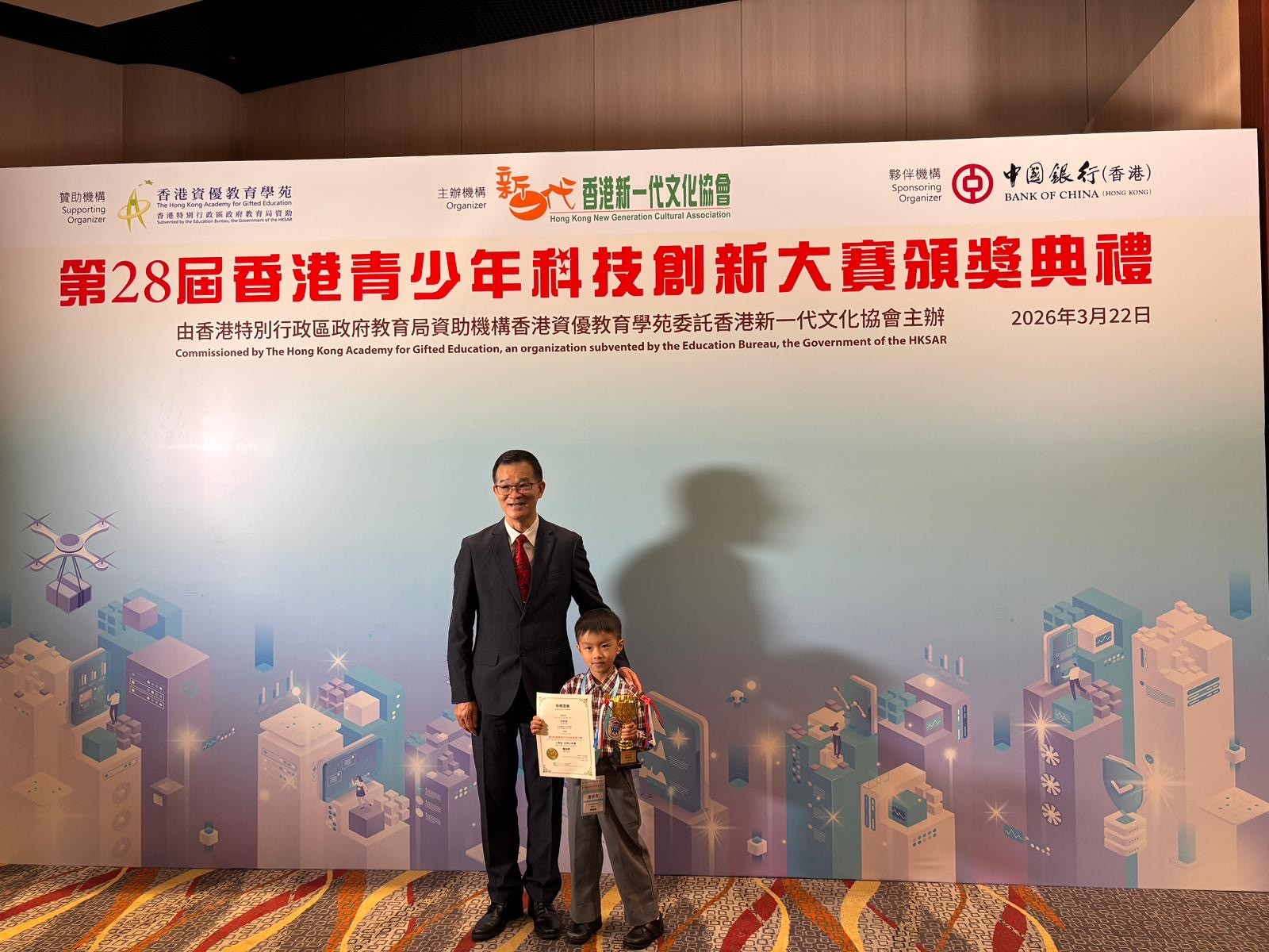【喜訊:恭賀本校同學於「第28屆香港青少年科技創新大賽」勇奪佳績!】 本校學生早前參加由「香港新一代文化協會」主辦的「第28屆香港青少年科技創新大賽」,在「科學幻想畫組別」中展現出非凡的創意與藝術天份,並獲得令人鼓舞的成績! 讓我們一起恭喜以下得獎同學: 5A 蘇朗𤋮《救火二法寶》榮獲【二等獎】 3A 簡菁儀《綠色校園文具再生號》榮獲【三等獎】 1C 尹希舜《能源共享》榮獲【優異獎】 除此之外,全賴師生們的積極參與和共同努力,本校更榮獲大會頒發【優秀組織獎】! 感謝指導老師們的辛勤付出,也再次恭喜所有得獎同學!希望大家繼續發揮無窮的想像力,將科學與藝術完美結合,未來創作更多優秀的作品!